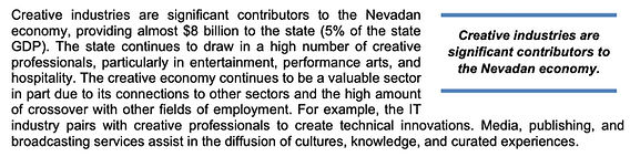 The ACE community is the driving force behind global tourism, event, education, and media contributing more to Nevada's GDP than Mining at $8 billion, or 5%. Arts mean jobs, a fact recognized in the Nevada Governor's Office of Economic Development in their February 2023 5-year strategic plan naming the Creative industries as a critical part of the state's diversifying economy.